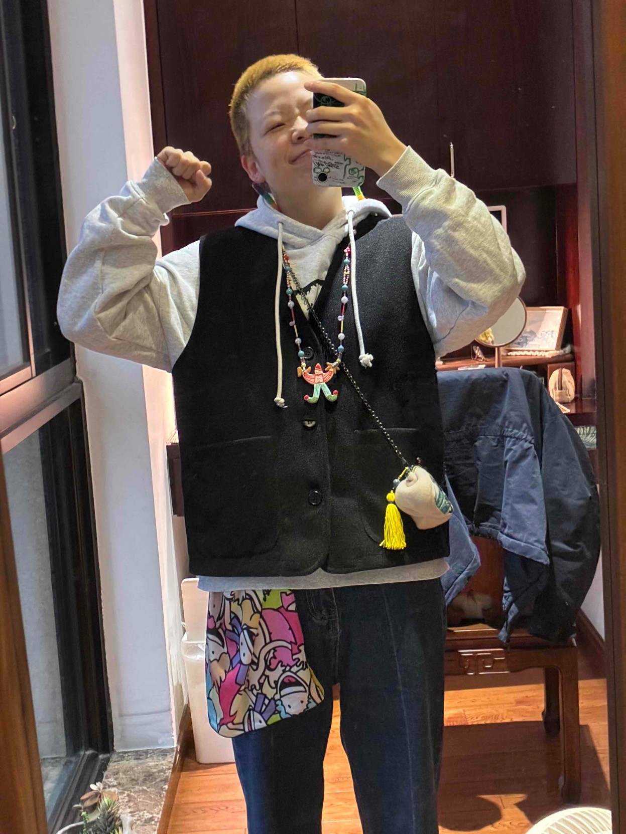 捡破烂的去上班,就是把所有东西都挂在身上这样,职业素养。