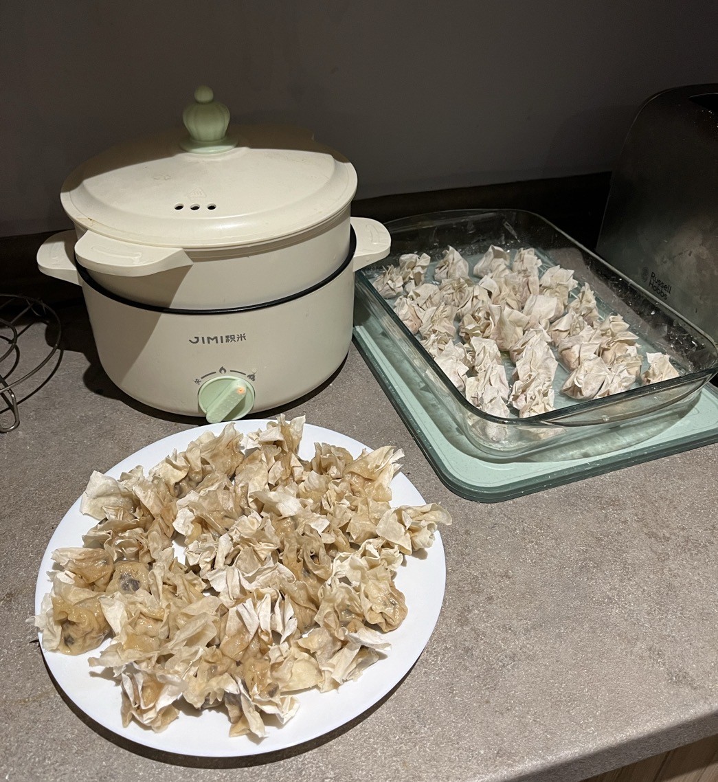 这次包了荸荠肉和香菇肉两种馅。燕皮包之前用小喷瓶喷水打湿洇软,比上次好包多了。估计一共包了一百个左右。蒸熟了冻起来,准备周五除夕夜煮福州年菜”太平燕“——鹌鹑蛋肉燕汤,寓意“安全太平”。