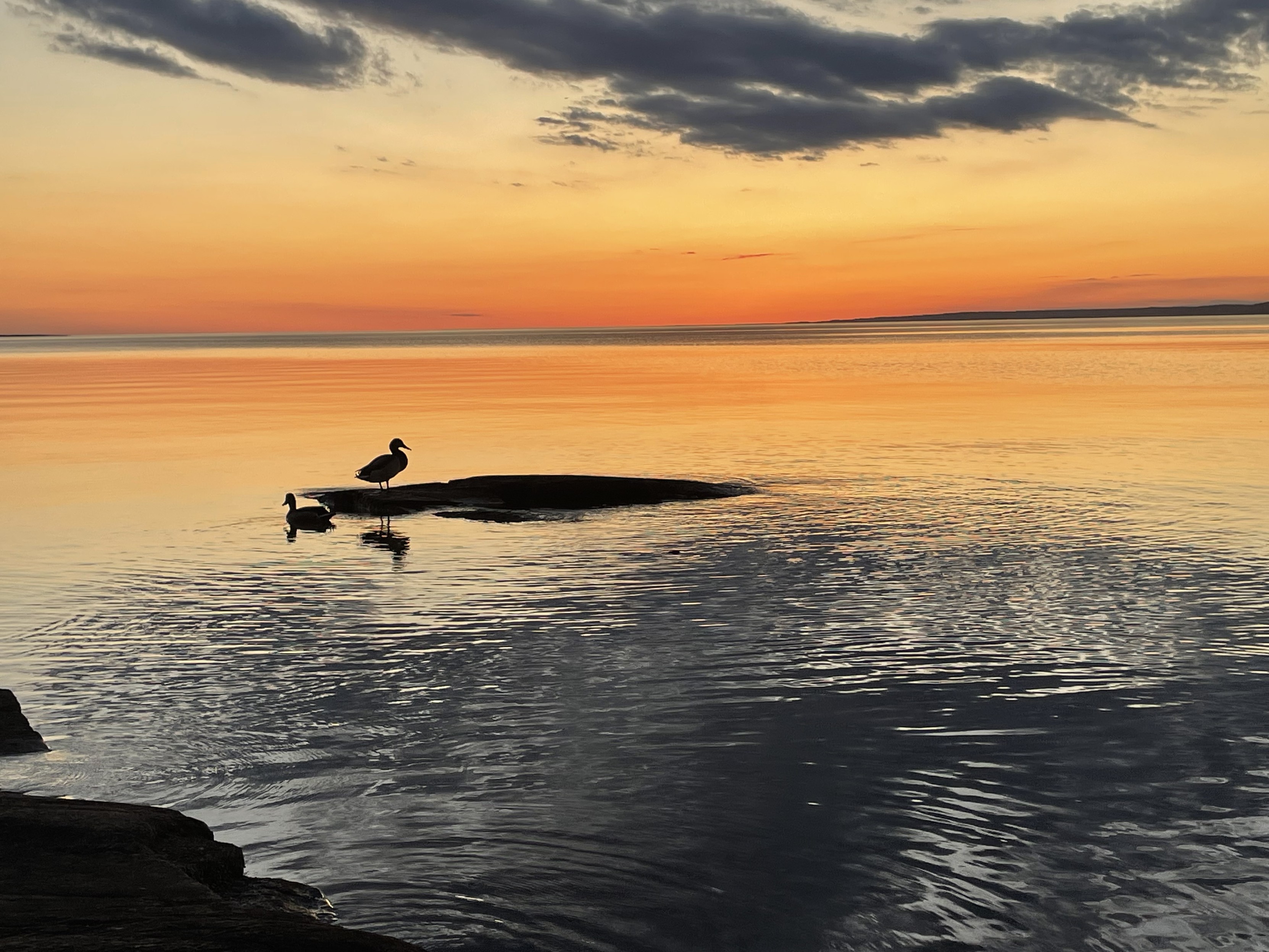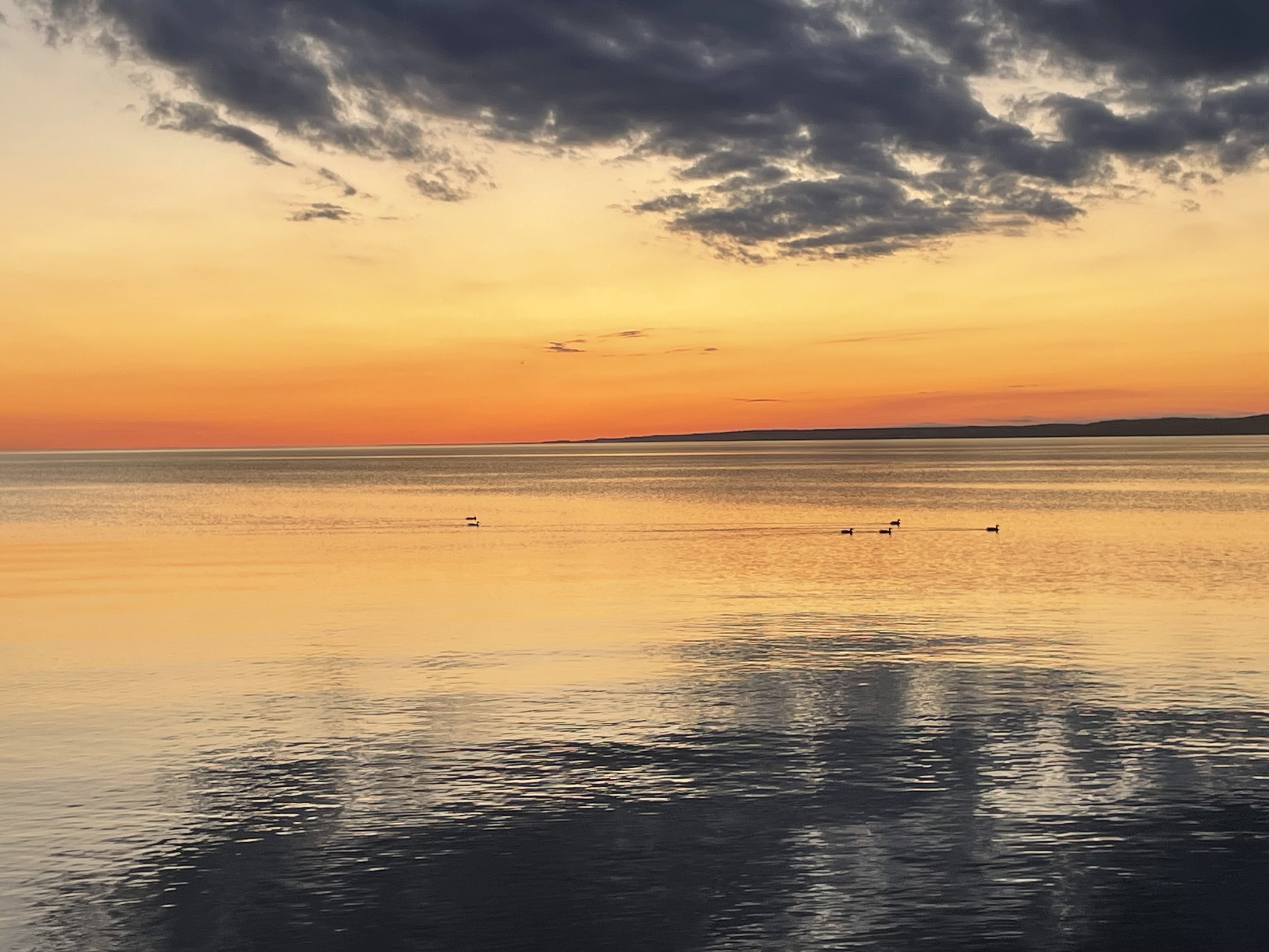 因为是个小镇,湖边非常非常安静。很难形容那种感觉,虽然听得到来看日落的人的嬉笑和音乐,小狗玩水的声音,鸭子从水上起飞的扑棱声,仍旧感觉安静得能听到自己的灵魂。从城里出来,再也听不到城里的呼吸,平滑如镜的水面淹没了我的灵魂。那一刻,仿佛整个宇宙都坍缩成了眼前的这一幅画面。