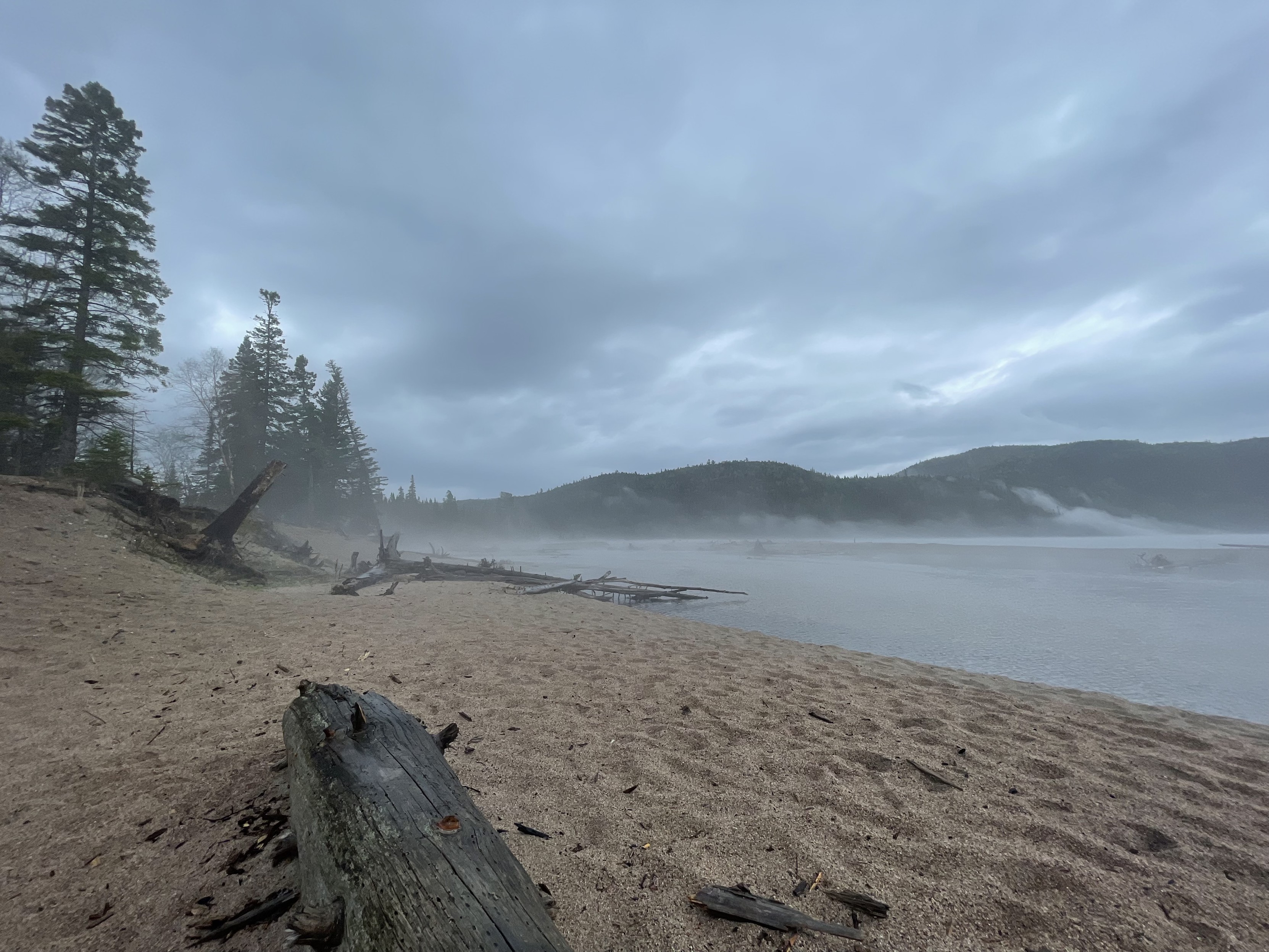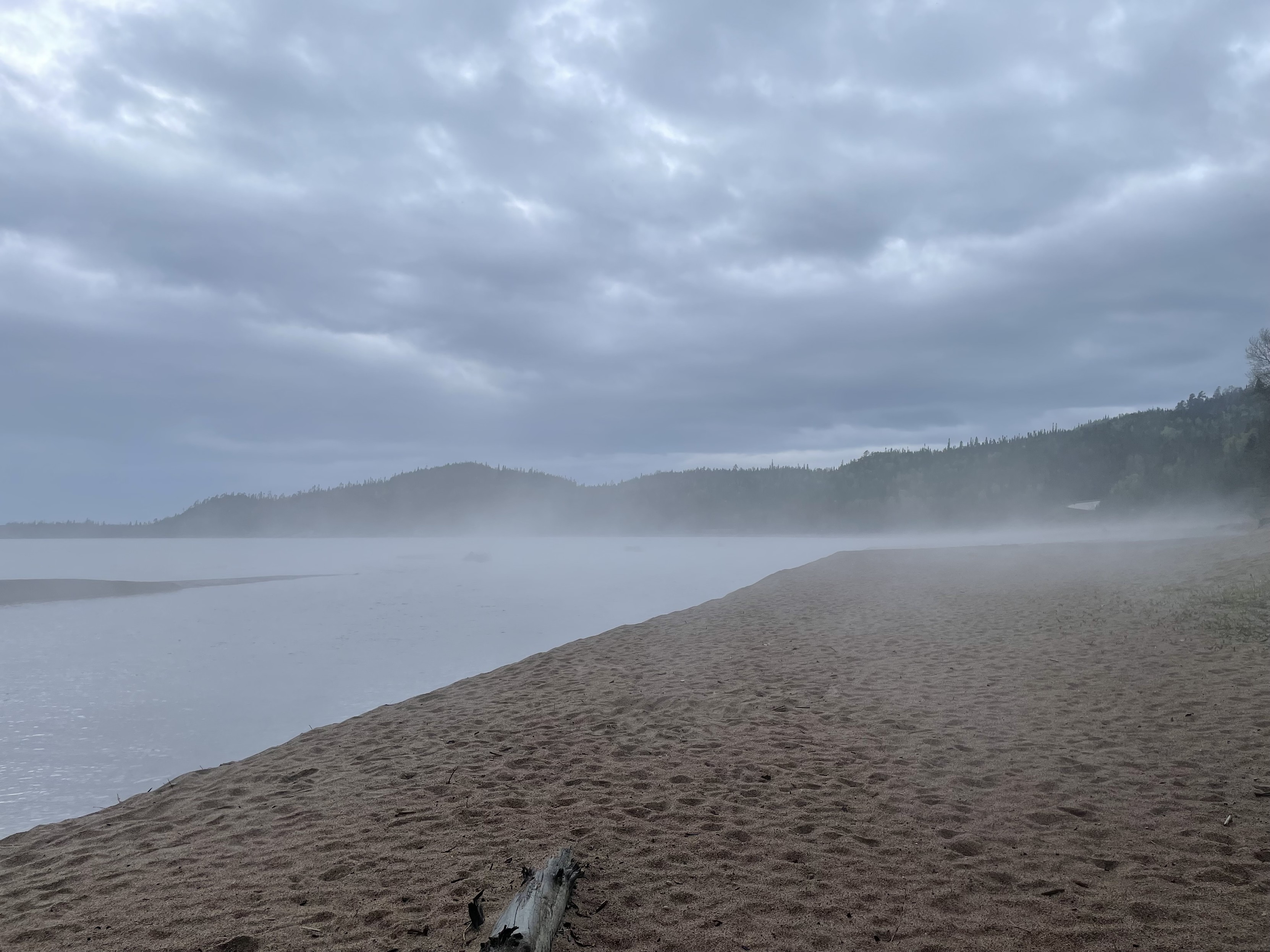 今天早上去完一个可以摸的小小爬虫博物馆之后继续赶路,已经开到高大上湖(Lake Superior)边上了。一天阴雨连绵,没怎么出太阳,高速路过海一般的大湖能看到湖面上升腾起濛濛的大雾来。银灰色的水面银灰色的天,连成茫茫的一片。雾顺着风又排着队整整齐齐从小路上爬上了山,前面后面什么都看不见。
