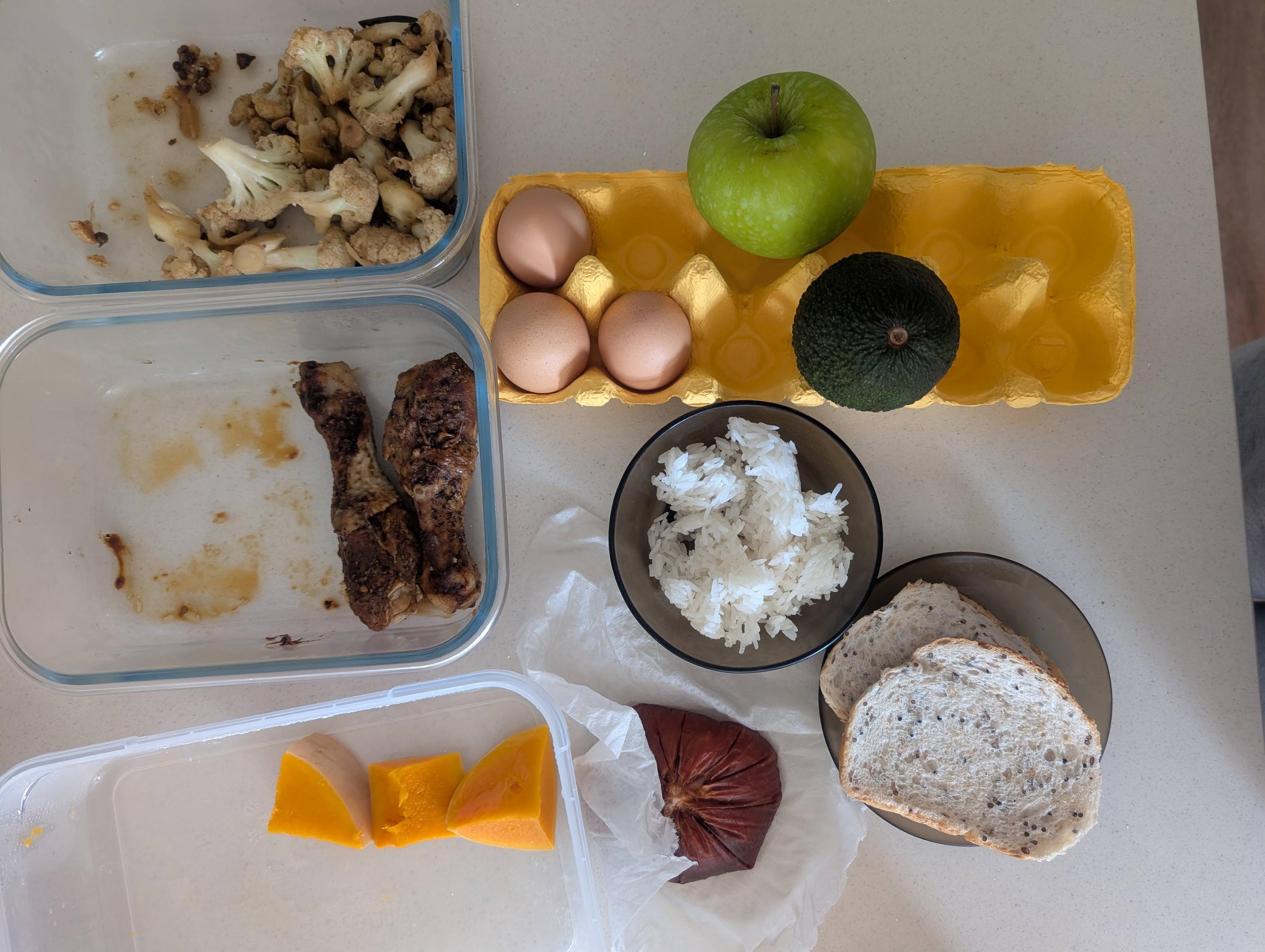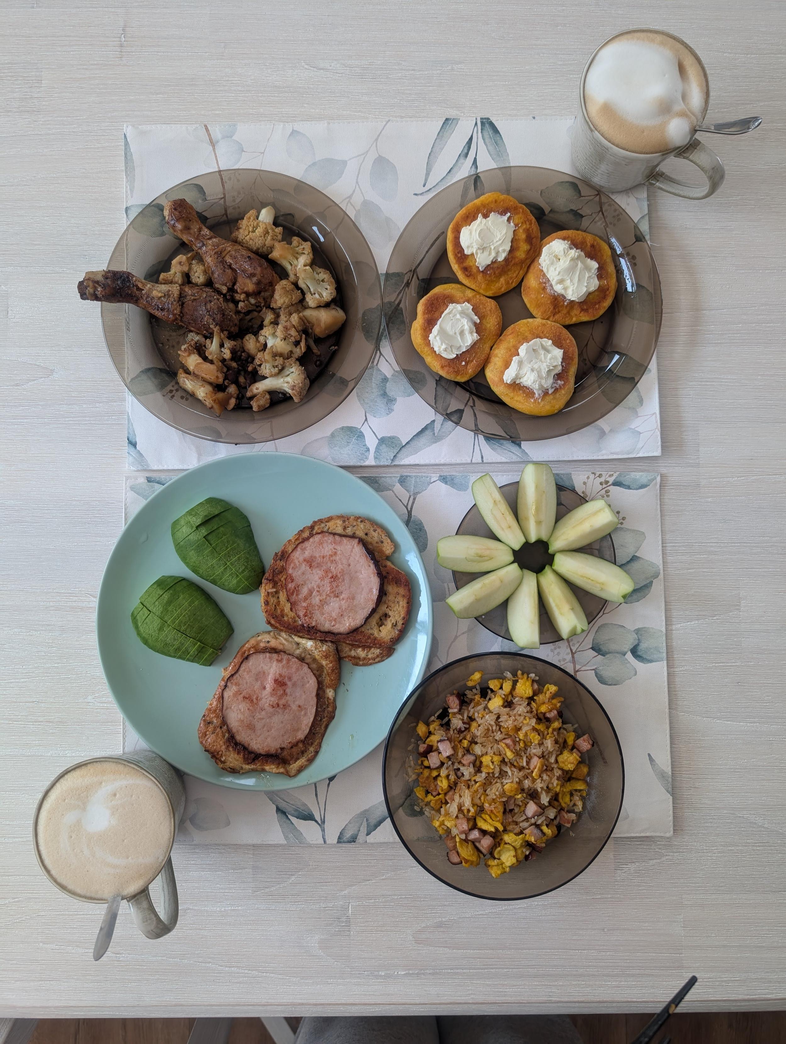 清空冰箱庫存:剩飯一小碗、南瓜三小塊、麵包屁股兩片、小雞腿兩隻、雞蛋三個、火腿屁股一塊、蘋果一個、牛油果一個、炒花菜一小盤,和牛奶、奶油奶酪若干。於是做了一頓史上最random早午餐。雞腿花菜熱一下。蘋果牛油果直接吃。三個雞蛋,一個加上南瓜和麵粉做成南瓜餅,抹奶油奶酪;一個加牛奶用來炸麵包片;一個加上火腿丁來炒(沒多少米飯的)飯。剩下的火腿切片煎一下。一點兒沒浪費(就是有點撐。。。真是強迫症患者友好的一頓飯啊!
