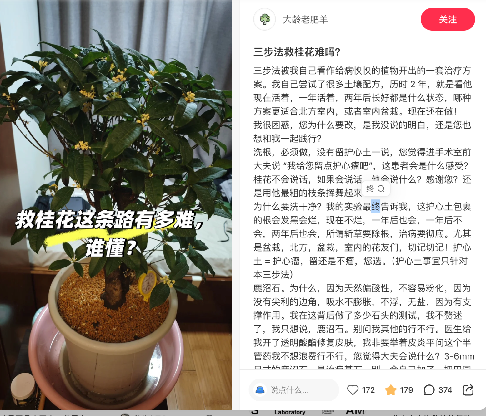 究其原因,黄泥土对于室内来说实在是太糟糕了。原本就很差的排水在室内条件下更不容易干湿循环,时间长了根系一定出问题,于是养了快一年时开始逐渐焦尖黄叶。再拖下去植株活性就会越来越差,请教的小红书养桂花的老师在电话里也建议说尽快搞,不要等天气凉。
