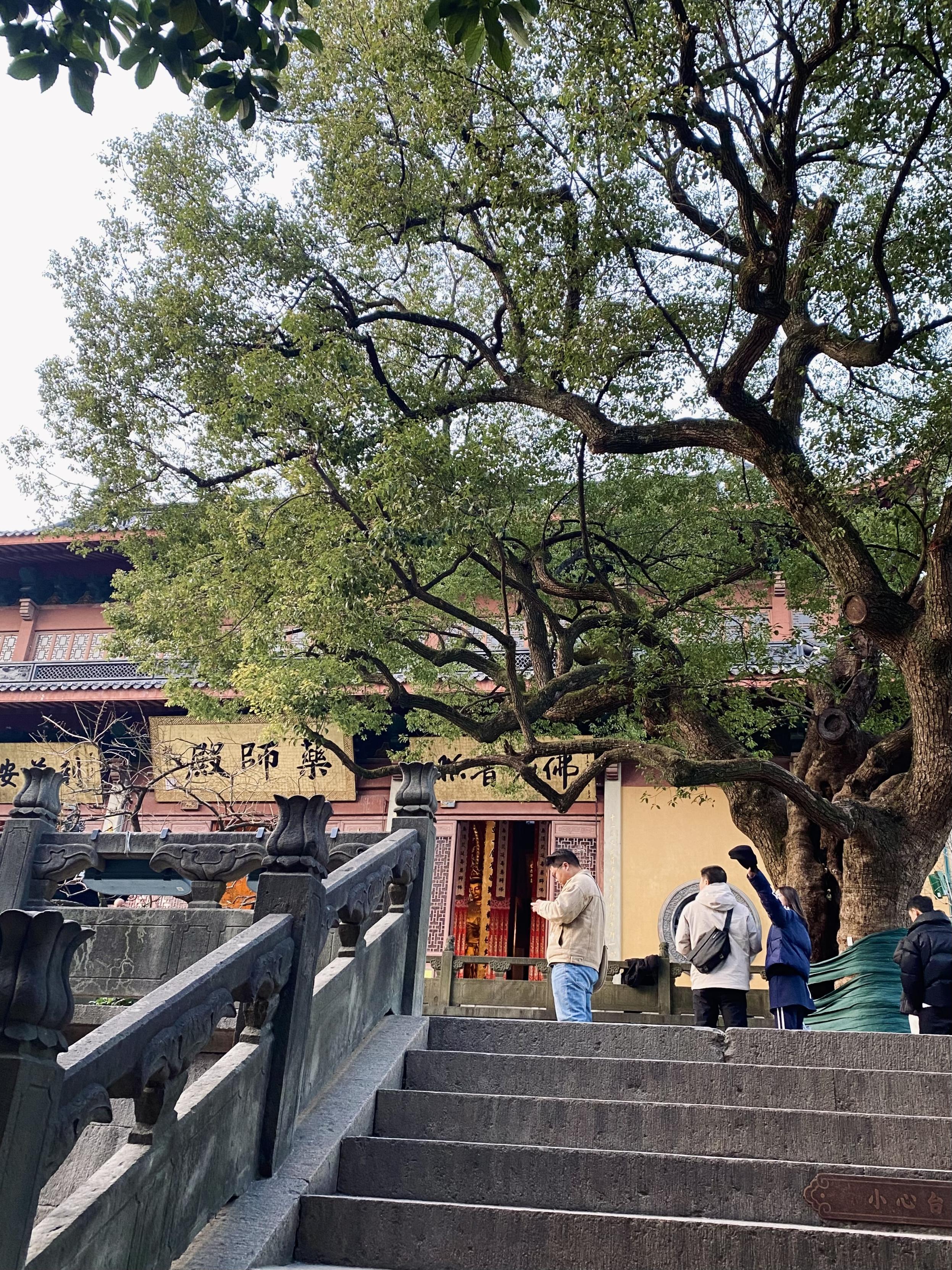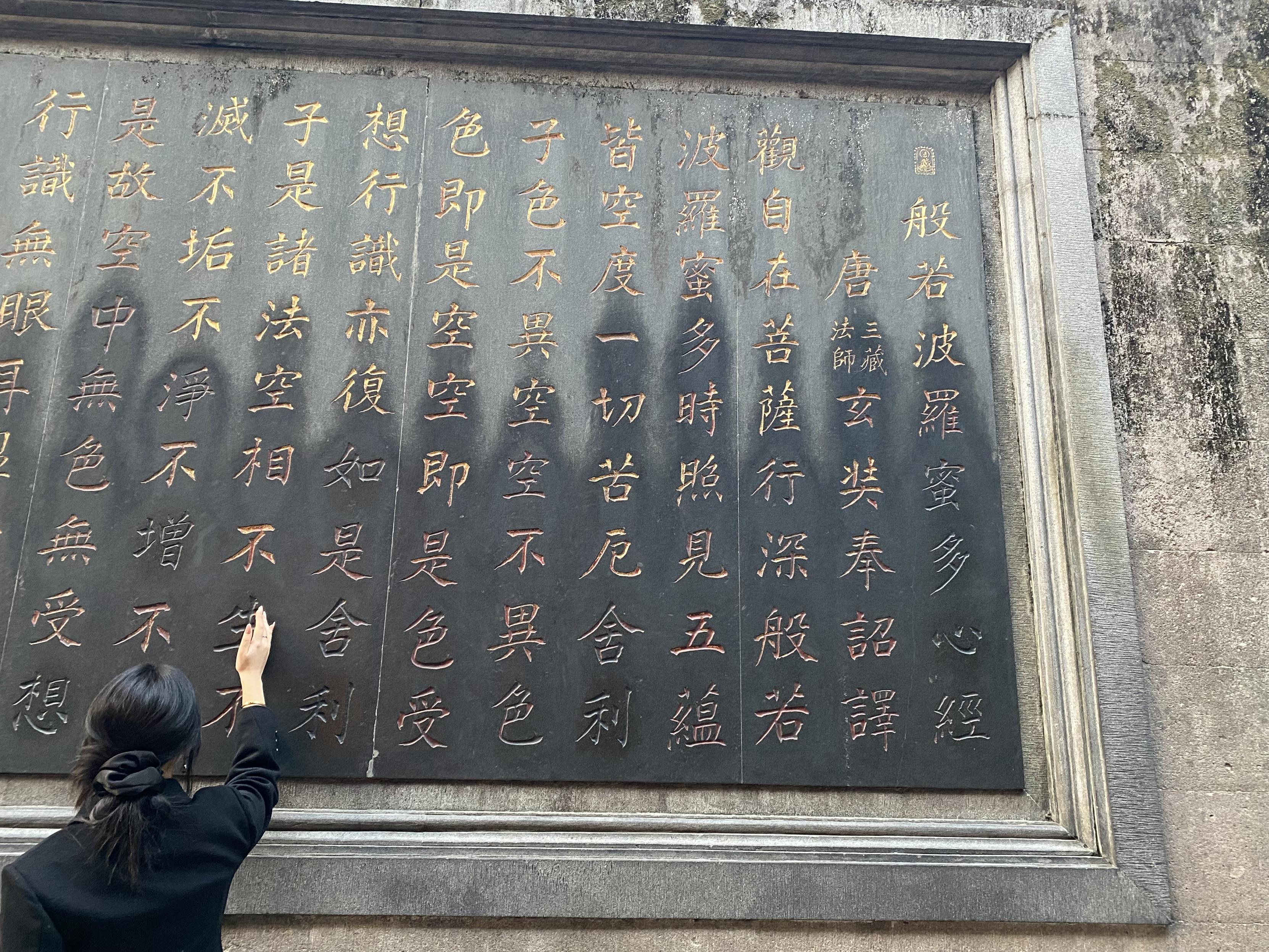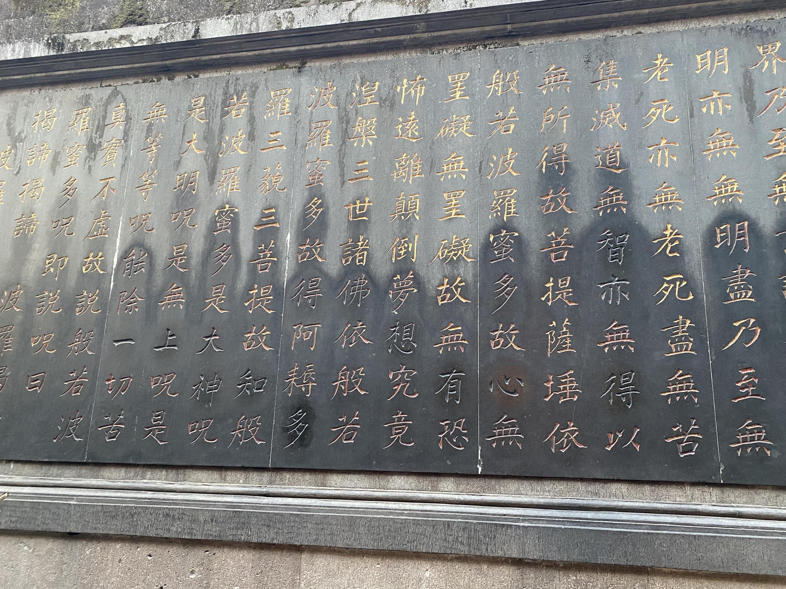 灵隐寺香火真旺啊。大殿里一群和尚在唱经,声压厚重(全男的,这也是个bros club哈)。感觉之前去佛寺都是人文价值超过宗教价值,灵隐寺可能是钱势逼人,颇有一些宗教威严感。但同时有好多干别的的,古风穿戴出片的,在金刚经上面摸自己想实现的字儿的(把利、增、生、有、得、知等字摸得黢黑,与此同时死字儿金光发亮。看下图),有种非常务实的世俗感