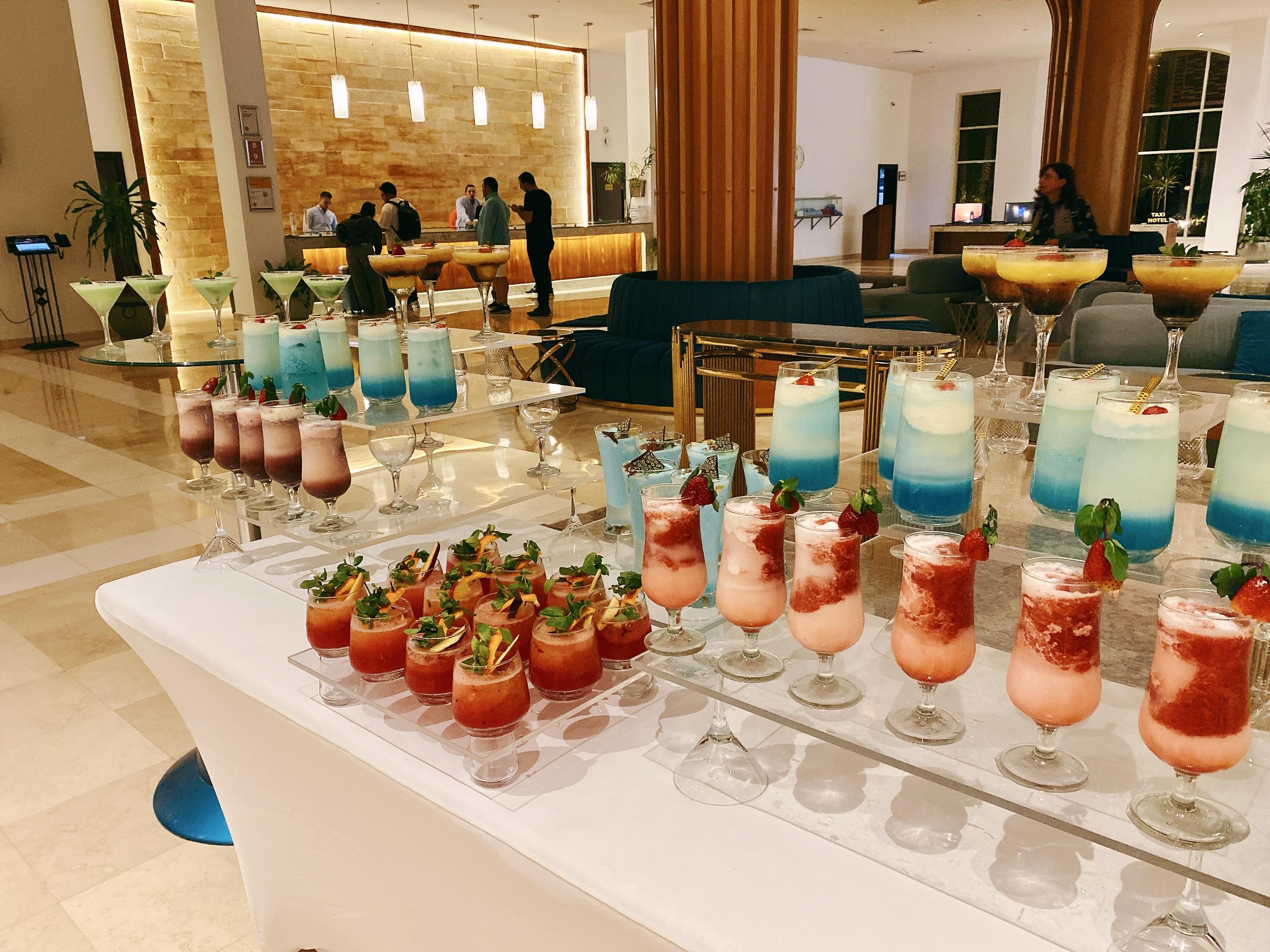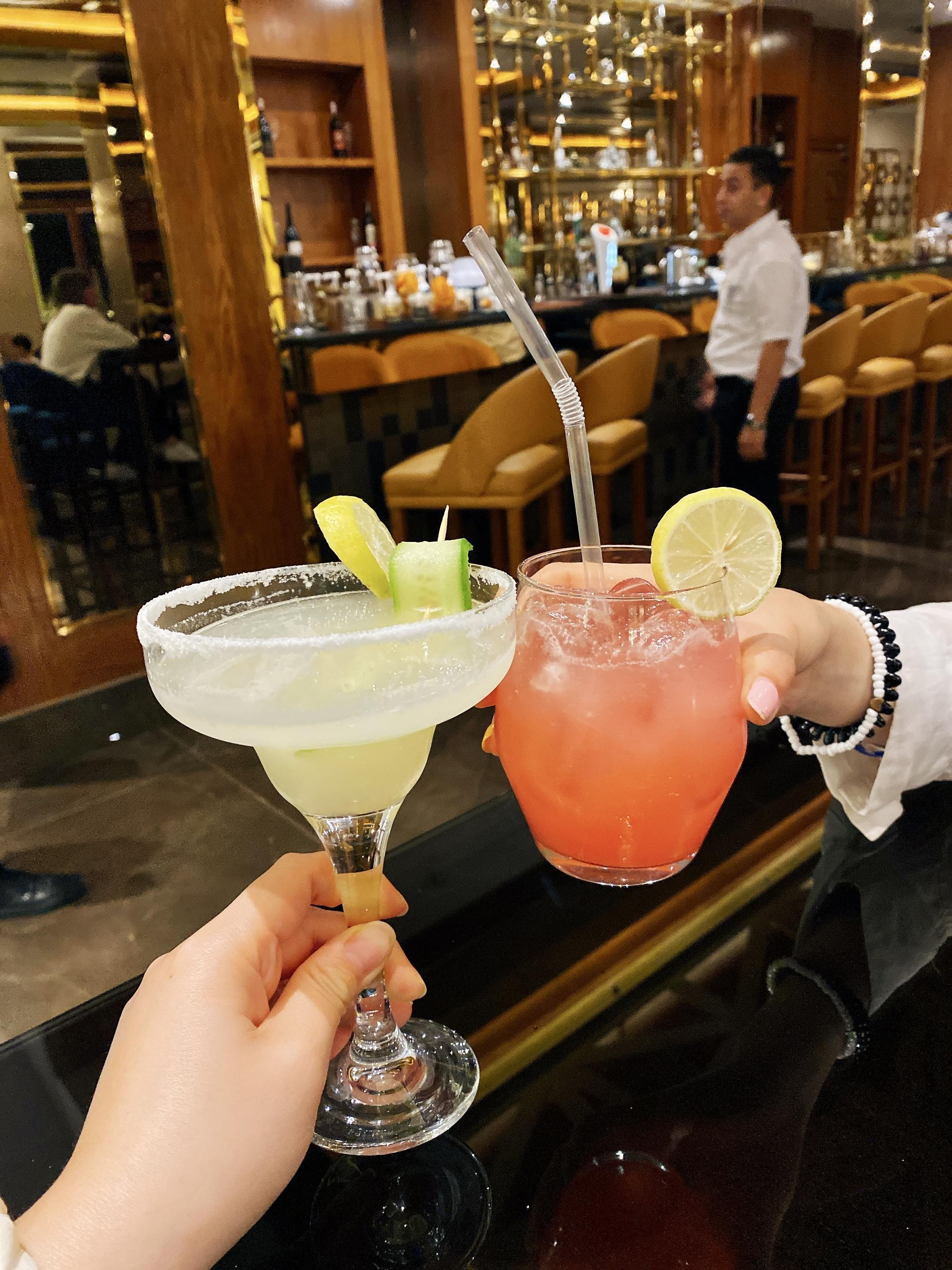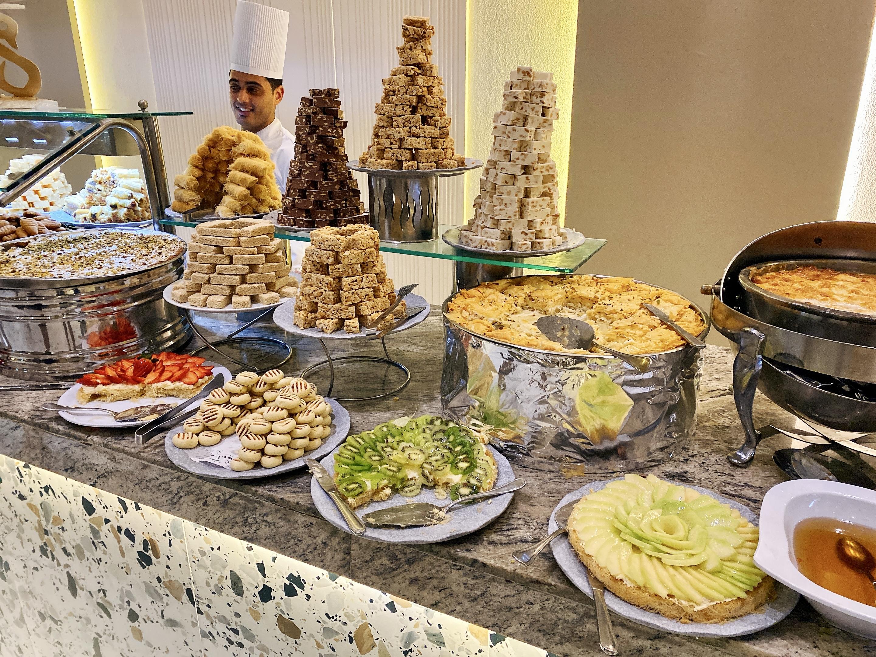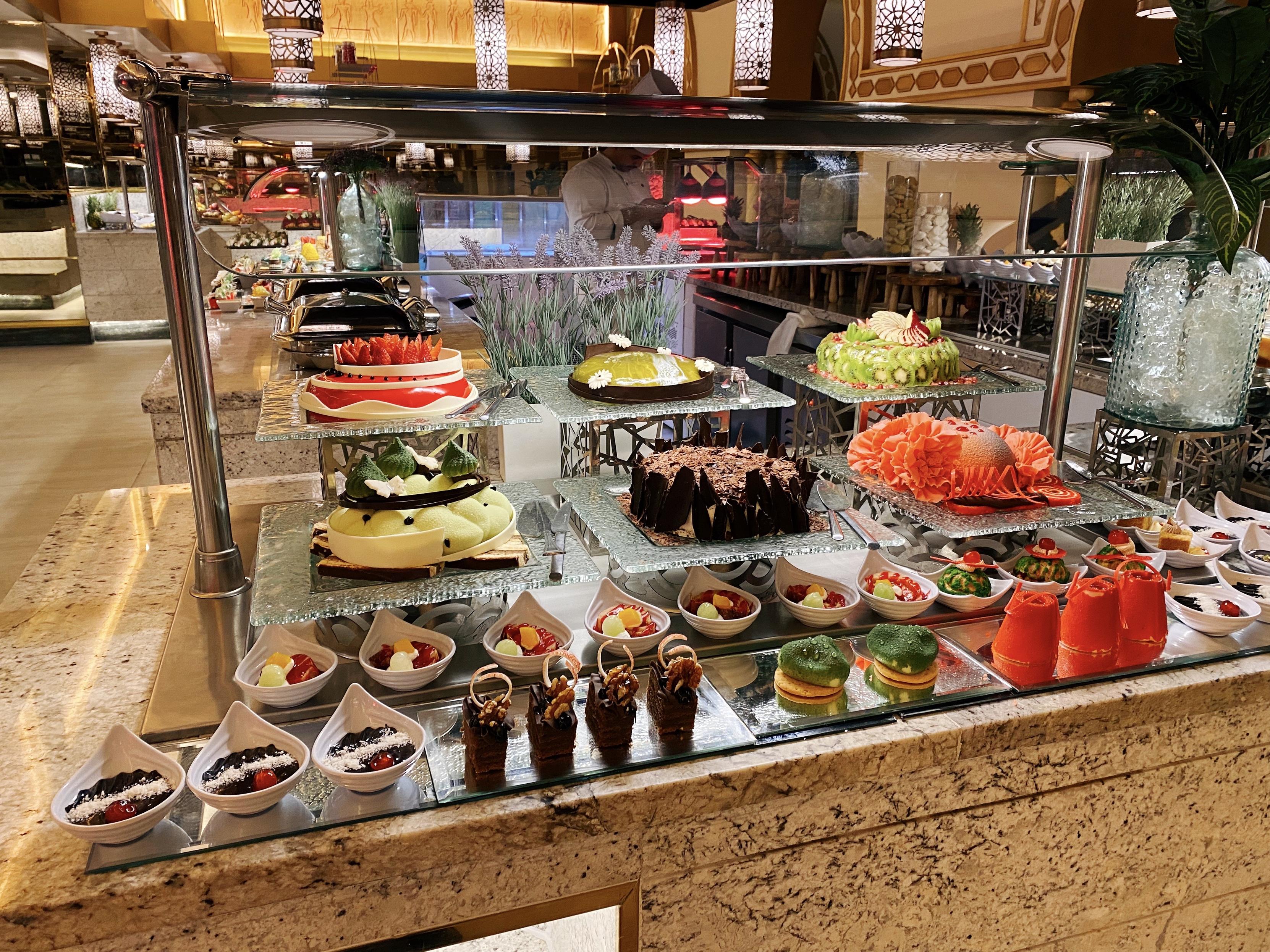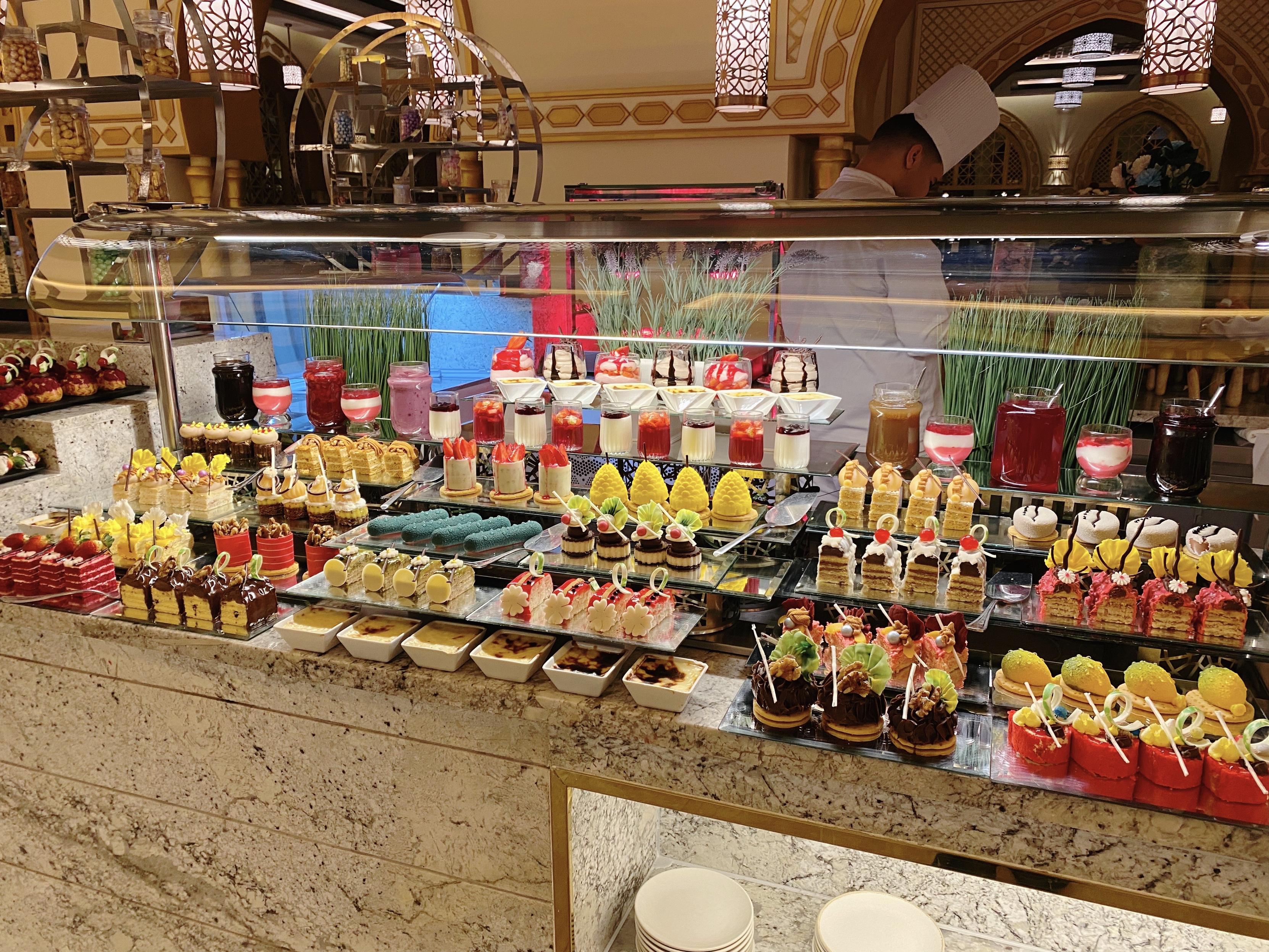 本来这个酒店号称五星级我是略有微词,但是今天的鸡尾饮料台是这样的,和昨天又不一样,而且很有漂亮!今晚的show和昨天也不一样,是什么埃及服饰的。晚饭也是吃high了,烤鱼美滋滋。甜品台每次都规模唬人,这是1/4,但是吃不来。