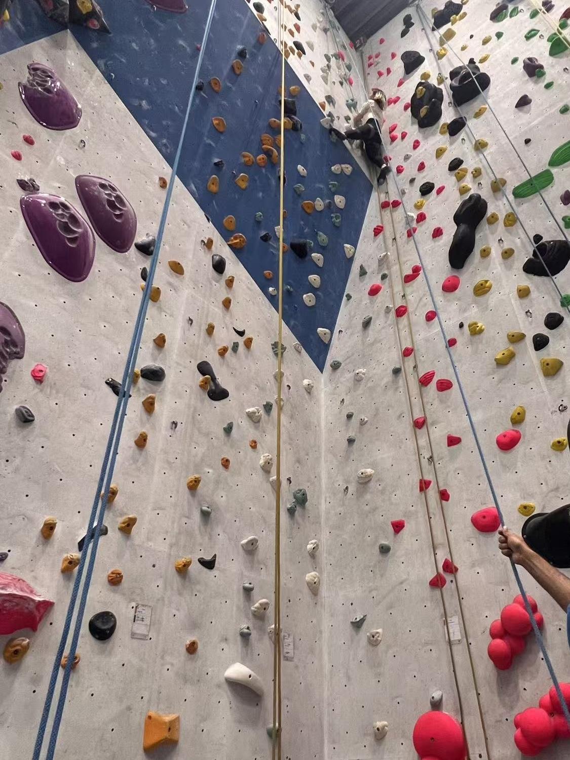 朋友拍的我在墙上,使用了0.7倍焦距技法把这个墙拍得特别高我笑死。其实我的需求是把我的肌肉拍得纤毫毕现若隐若现,氛围感肌肉,因为客观存在上尚不太明显。这条线挺舒服的,踩在角上三角支撑基本不用手,但是我很怕高、很怕保护不靠谱、很怕belayer发梦