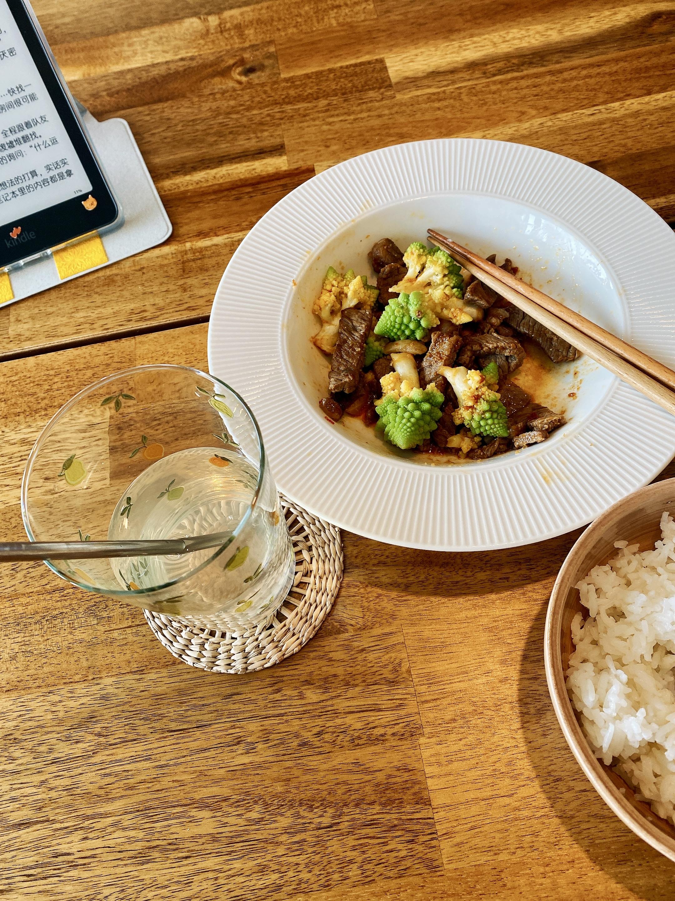 午饭吃肉眼牛肉炒宝塔菜花。苹果黄瓜味气泡水。冻过的米饭(更健康?)牛肉用桂林辣酱、沙茶酱和豆瓣酱炒的,没放配料懒得切,看似平淡,实则香得我咪西咪西~^_−☆
