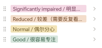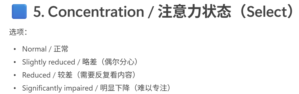 而且我对身体状态的感知很不敏锐,状态不好我要特别久才能发现!!所以我让gpt给我做了个副作用监测结合偏头痛记录表每天做一下。我觉得这量表我都理解不了更别提打分,例如:给精力水平打分,(不是困不困,是“能不能动脑”)——我请问?我都记不得我今天早上在哪里动脑了!我都意识不到什么活动算是动脑!我怎么打啊,我对身体没有觉察(这个不是post COVID症状,这是我从小到大的大脑特质,,)
