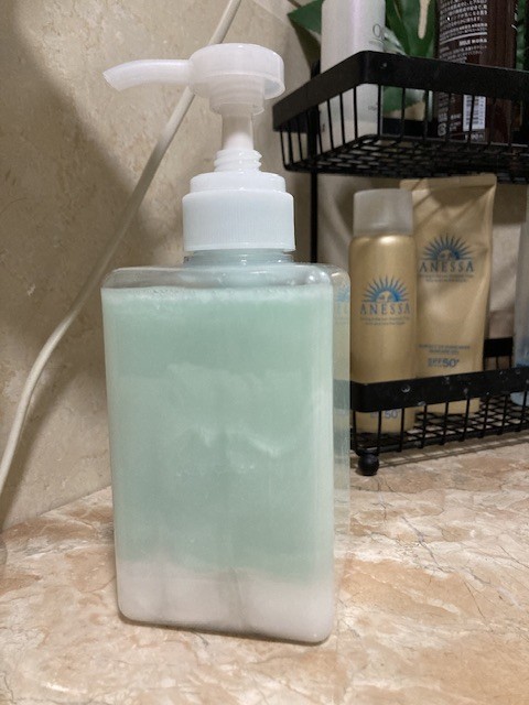 新买的分装沐浴露是蓝绿色的,倒在白色的沐浴露上面,蓝绿色的好像要稀一点儿?不知道他们会混在一起?还是就这样分层让我先用掉白色?