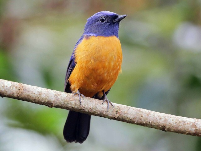 Chunky flycatcher of Sumatran highland forests. Male is bright royal blue above with a darker face and orange underparts. Female is brown overall with extensive gray on the underparts and gray tinges on the nape and wings. Inhabits montane broadleaved forests. Moves with mixed flocks and makes sallies from perches. Song is a bright but wavering series of tinkling whistles.