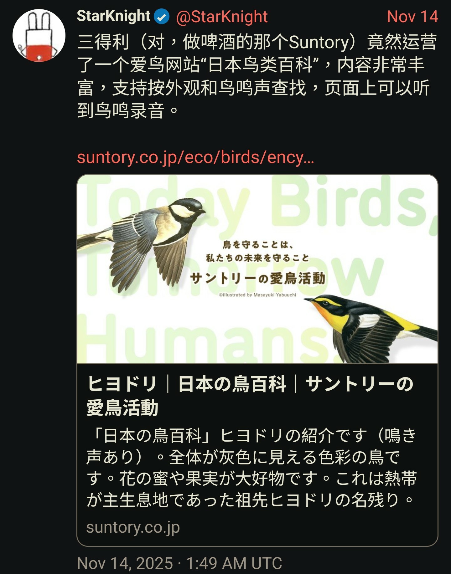 連結在該嘟文發出之時且在中國可以訪問;結果來自『Blocky』(其連結放下方):<https://www.suntory.co.jp/eco/birds/encyclopedia/detail/1482.html>」連結在中國訪問需要非常規手段;結果來自「Blocky」(其連結放下方):<https://nitter.net/StarKnight/status/1989148566569545878>