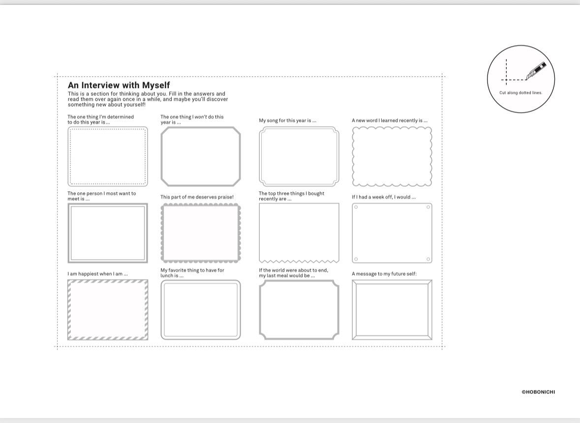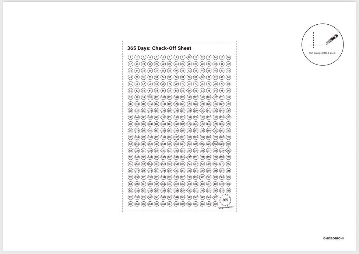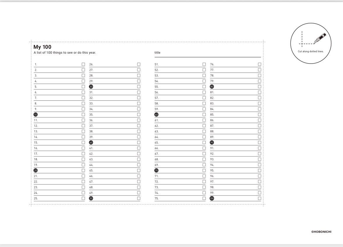 或许有象友需要,hobo官网有很多素材,类似于今年要做的100件事/要看的100本书/365天打卡之类的表格,多数表格英文版和日文版都有,还有一些杂七杂八的野球计分表/日本各地温泉/应季食物之类的表格只有日语版,有不同规格,可以自己下载用A4纸打出来裁一裁加进手帐里。