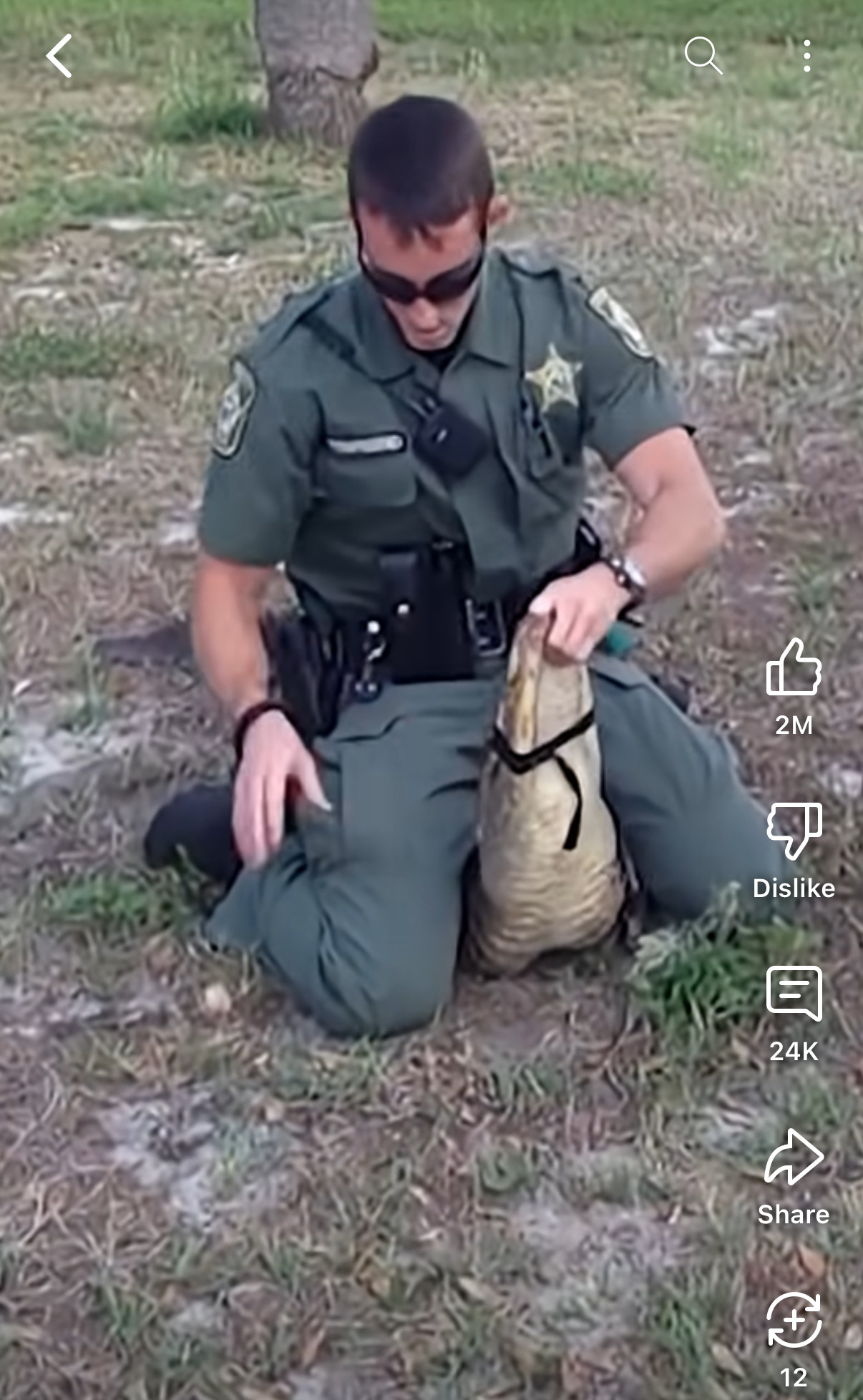 一开始还以为是个段子,结果现实中就是这么收纳鳄鱼的,比如美帝警察出警,先是挑逗几下鳄鱼,鳄鱼的爆发力强但是耐力和体力很差,挑逗几次就“一鼓作气再而衰三而竭”了。然后瞅准时机骑坐在鳄鱼上面,摁住嘴,用绳子把嘴捆起来就行了。