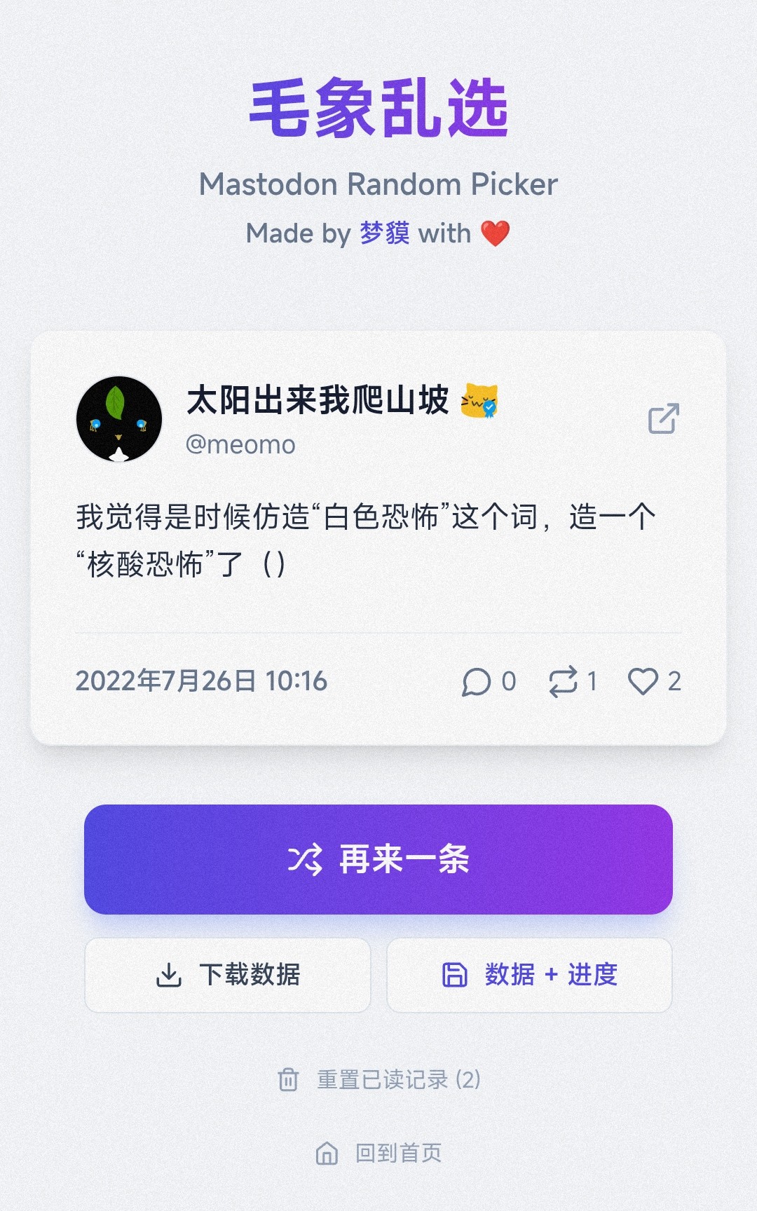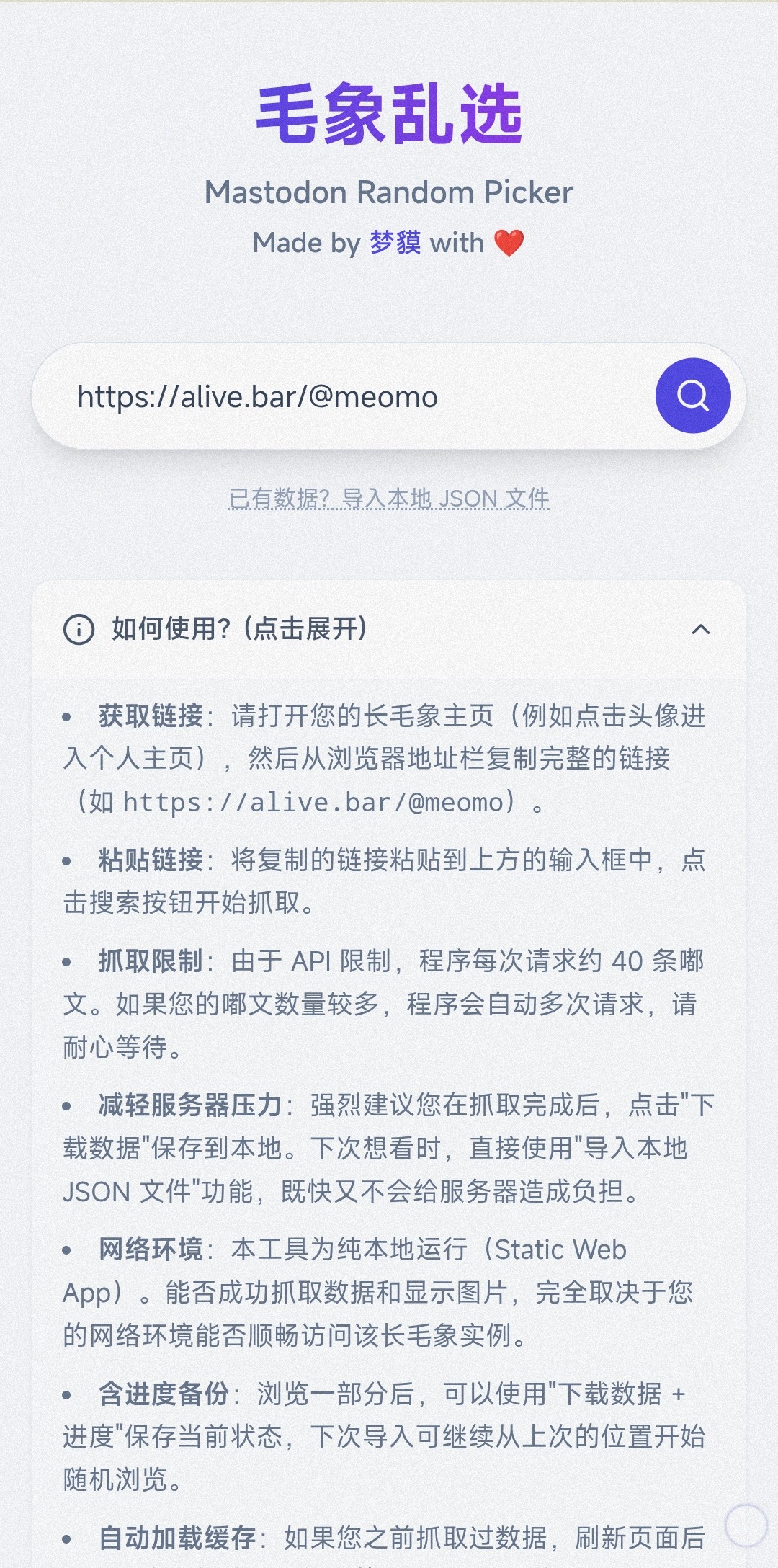 输入自己主页的链接,就可以以随机的方式查看自己曾经发过的嘟嘟(虽然但是…有什么用…但是就是好玩啊!)