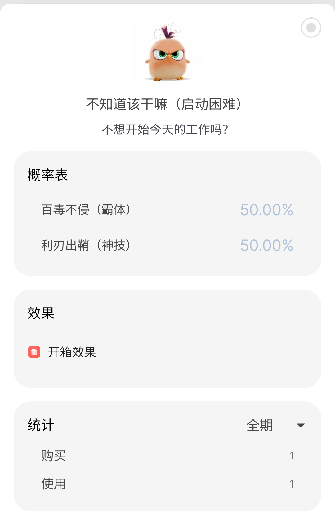 #ADHD 今天早上又遇到了#启动困难 ,但我最终克服了!我发现这种精神奖励好像对我很有效(?)换言之,我的大脑竟然如此容易受骗 :0160: 特别是这个奖励不仅可以增加我的各方面经验值(自己设置的),让我有一种获得感,而且还有倒计时!霎那间,仿佛我就是那个,摩拳擦掌跃跃欲试已经做好起跑准备、只等裁判员一声令下就能拔足狂奔的运动健儿!哈哈哈给遇到相同困扰的小象们提供一个思路。另外,推荐一个好用的计时器!是12面体,翻转计时。一共11个数字(3/5/10/15/20/25/30/35/45/60/90),哪面朝上就开始对应数字的计时,直接摆脱手机束缚,巨巨巨好用!而且只需要35块钱! :noii18: