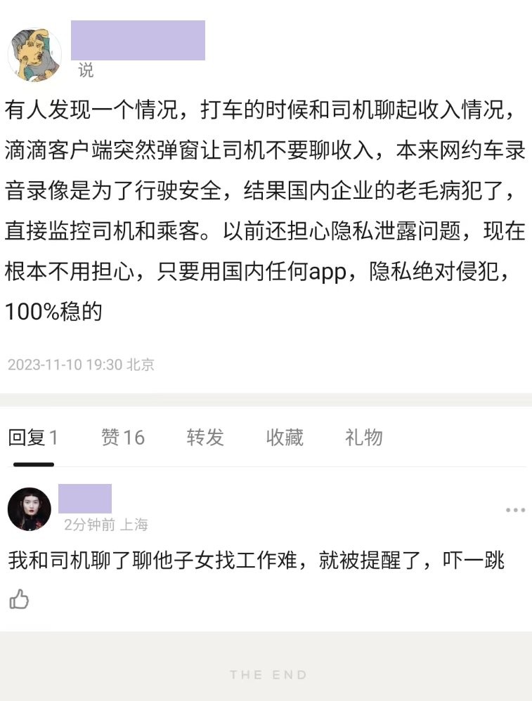滴滴app监控对话,制止乘客谈论收入。
