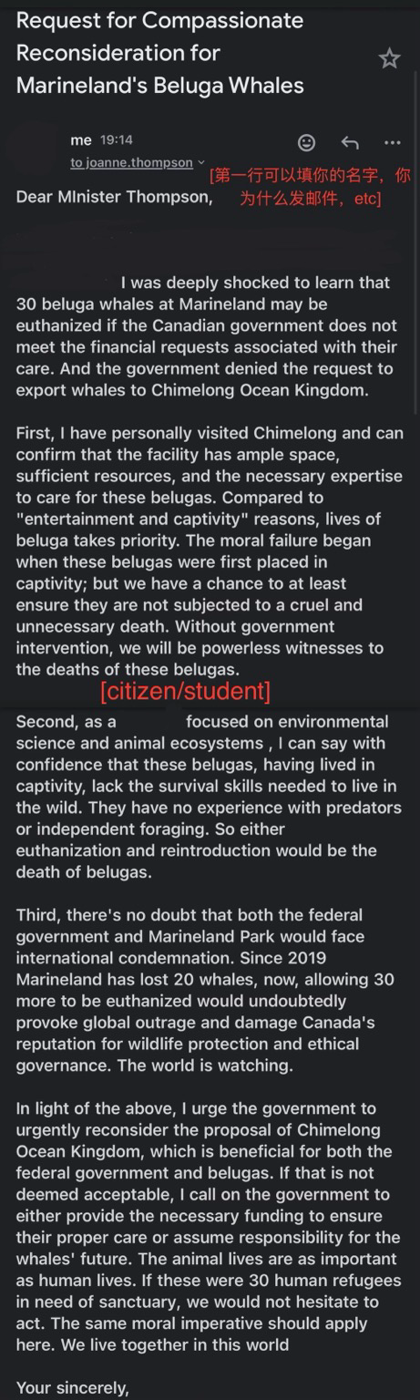虽然该申请在10.07已过期但目前最新的消息还没出我还是想试一试救一救😢,外网新闻报道与国内新闻报道见链接,有能力的可以去给Minister写邮件,邮箱为joanne.thompson@ parl.gc.ca,我写的邮件可以参考我会发在讨论串里,有能力的朋友也可以联系当地动保/环保组织!因为很紧迫没有能力搜集更多资料如果有朋友跟进/其他信息可以和我联系!