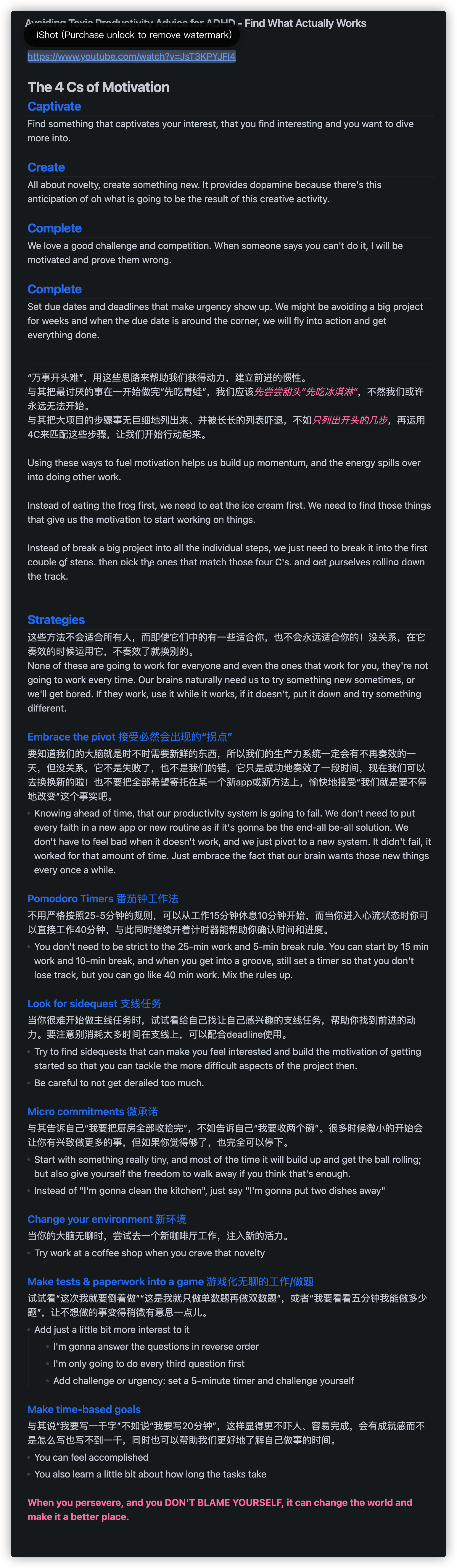 - 当你很难开始做主线任务时,试试看给自己找让自己感兴趣的支线任务,帮助你找到前进的动力。要注意别消耗太多时间在支线上,可以配合deadline使用。