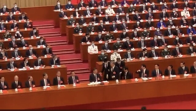 胡锦涛被请出二十大会场,习近平在旁边协助,右侧的官员稍微搭了把手,等胡锦涛终于起身的时候擦了一下额头的汗。而坐在习近平旁边的李克强全程没有参与,只是坐直了身子,不发一语,脸上也没什么表情,但还是很显著,很容易被认出,让人忍不住揣测。就像当初有个新闻,习近平接见张佳梅,他在一旁用非常好奇的目光看着那个被嘉奖之人,他很容易被认出,在这个罗网般的政治局面中很容易被认出,所以我想这也是“习下李上”素材的来源之一。但我要讲的是什么呢,就是这短短一分钟的画面,不需要任何媒体任何旁观者的解说,它一目了然,又不得其解,体现了这个严丝合缝牢不可破的政治落网幽微的一角,比我过往几年看过的电影电视剧情节都更加离奇,在那种震惊的持续冲击下,我甚至有种生理性呕吐的感觉。