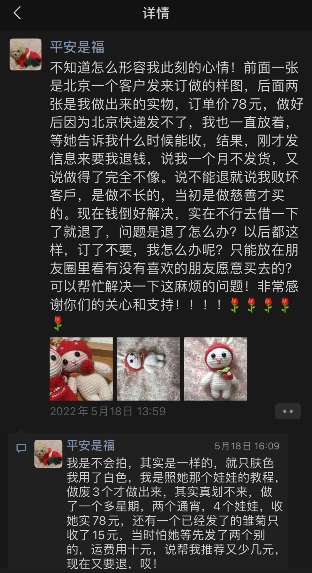 武汉海燕阿姨这两天发的动态。看了真是……她说兔子也一起寄过去了,对方是个高中生,说要举报阿姨诈骗,她气到没有给对方退款……