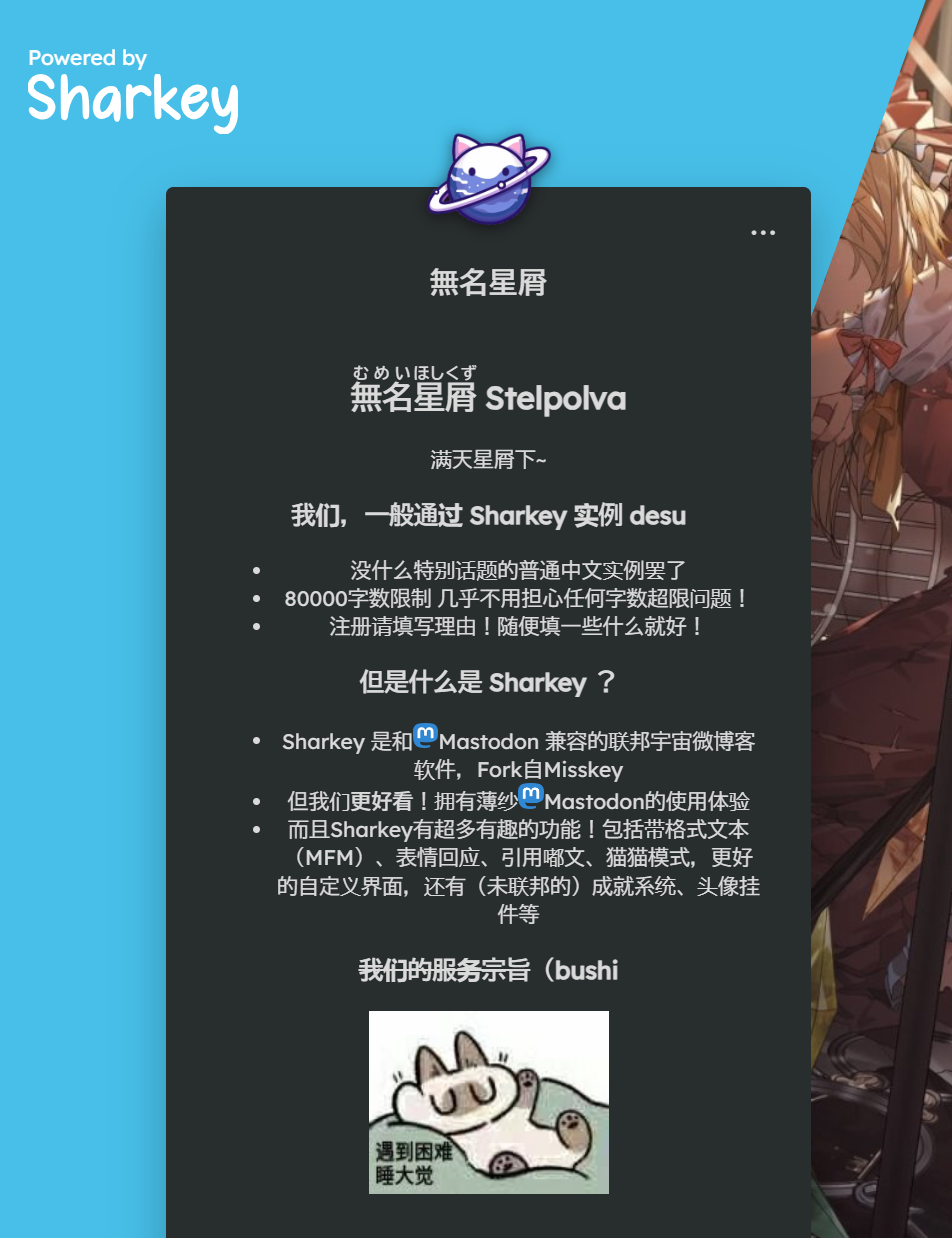 星屑更新后容纳量大约多了100人了!也稍微更新了一下简介,毕竟我们已经不再是firefish了