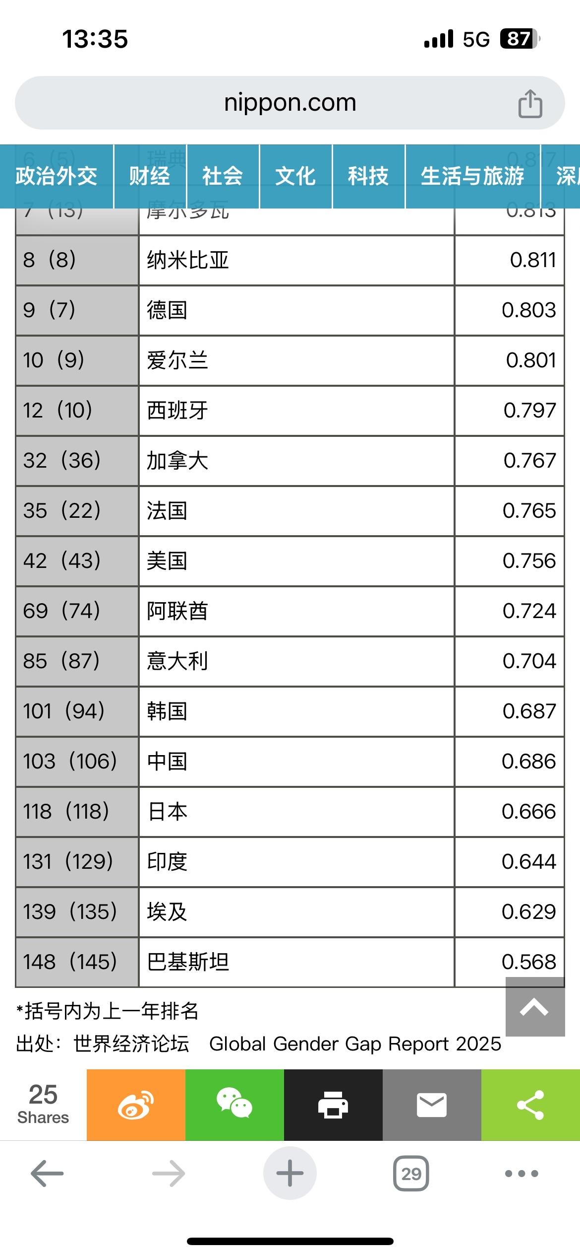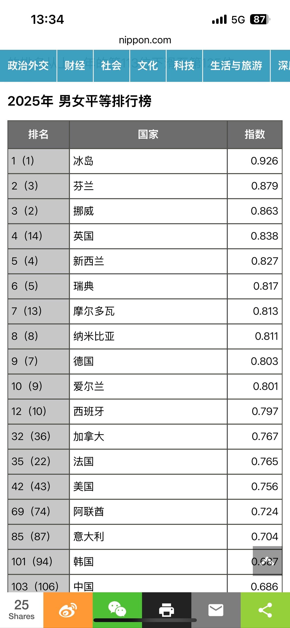 2025年全球男女平等排行榜,东亚三大国再次喜提100名开外,要不怎么说东亚是女性地狱呢?